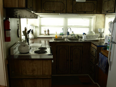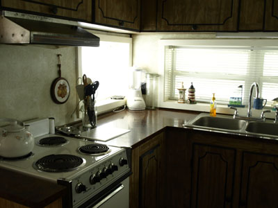 The Kitchen is like a ship's galley, with windows on 3 sides, looking up and down Mermaid Drive and out onto the deck.
